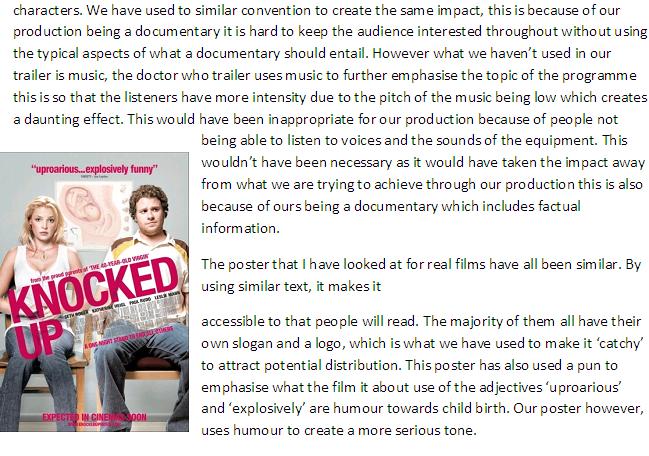 In comparison to real advertising products the doctor who trailer for series 5, they have also used a collaboration of sounds. This works effectively because it automatically engages the listeners by using extracts which will be included in the episode. This helps keep them entertained because they have used a suspension of your thoughts to get you into the story to make you want to watch this. This shows evidence to Richard Dyers theory of entertainment. The use of different sounds also works because of it intensity, making the listeners think they are in the situation of the story that makes them empathise with the characters. We have used to similar convention to create the same impact, this is because of our production being a documentary it is hard to keep the audience interested throughout without using the typical aspects of what a documentary should entail. However what we haven’t used in our trailer is music, the doctor who trailer uses music to further emphasise the topic of the programme this is so that the listeners have more intensity due to the pitch of the music being low which creates a daunting effect. This would have been inappropriate for our production because of people not being able to listen to voices and the sounds of the equipment. This wouldn’t have been necessary as it would have taken the impact away from what we are trying to achieve through our production this is also because of ours being a documentary which includes factual information. http://http//youtu.be/KjcRilsjWcc